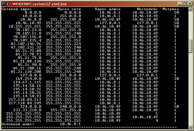 - Добавляем статические маршруты до DNS-серверов и в сети с провайдерскими VPN-терминаторами. В моем примере Gateway=»10.46.8.1″, в вашем случае он будет другим. Выясняется подключением машины с виндой и командой в cmd «route print» вот таким образом: