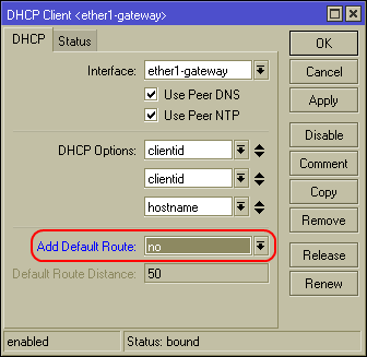 - В настройках DHCP-клиента выключаем модификацию Default Route. Mikrotik — не винда, маршрут по умолчанию через серый гейт ему не только не полезен, но и вреден.