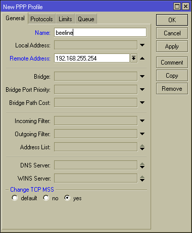 - Создаем новый PPP-профиль. Называем его как-нибудь понятным образом. В поле «Remote Address» указываем любой адрес из приватного пространства, не пересекающийся с адресами нашей локальной сети и сети провайдера. Я совершенно «от балды» выбрал «192.168.255.254», это не играет никакой роли. Опцию «Change TCP MSS» ставим в «yes». UPDATE: change ставим в «NO»!