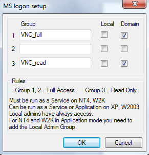 Далее нажимаем кнопку Configure MS Logon Groups прописываем две доменных группы, которые будут иметь полные права для доступа к клиентской станции и право только на просмотр соотвественно. Необходимых пользователей мы потом внесем в эти группы через AD.